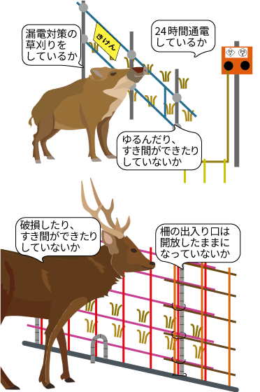 ワイヤーメッシュ柵などの場合は、草刈りとすき間・破損がないように管理しましょう。