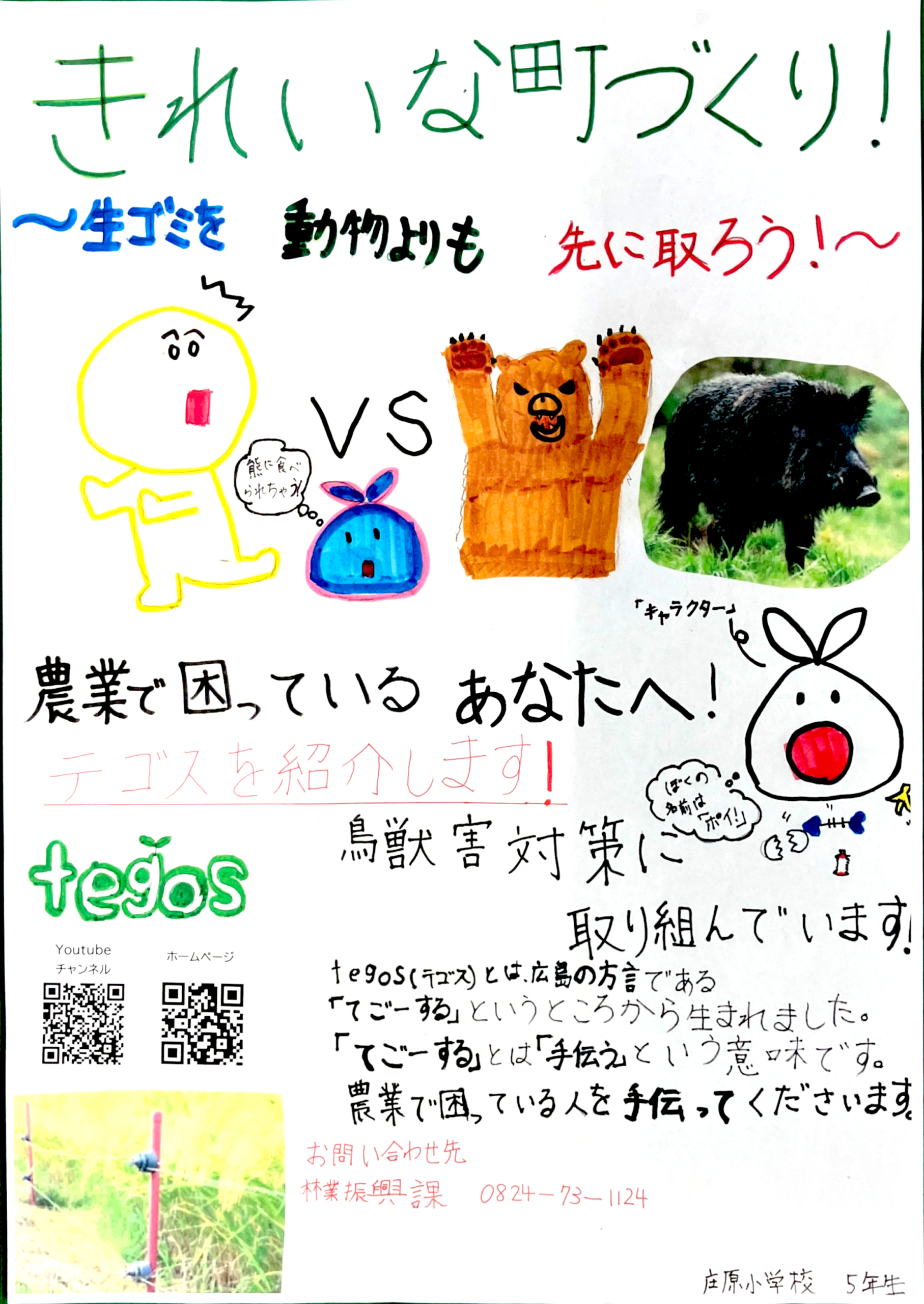その内容をうけて、児童の皆さんが庄原市内の皆さんにもっとテゴスを知っていただけるよう、ポスターとキャラクターを考えていただきました!